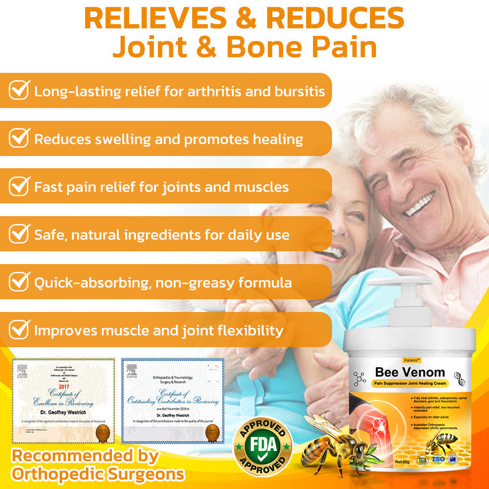 Εγκεκριμένη από ορθοπεδικό χειρουργό, η Κρέμα Ανακούφισης Πόνου και Θεραπείας Αρθρώσεων με Δηλητήριο Μέλισσας έχει σχεδιαστεί για την αποτελεσματική αντιμετώπιση ορθοπεδικών παθήσεων και την ανακούφιση του αρθριτικού πόνου μέσα σε 3-6 εβδομάδες.